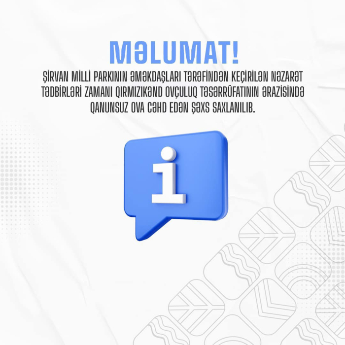 Şirvan Milli Parkının əməkdaşları tərəfindən keçirilən nəzarət tədbirləri zamanı Qırmızıkənd ovçuluq təsərrüfatının ərazisində qanunsuz ova cəhd edən şəxs saxlanılıb.