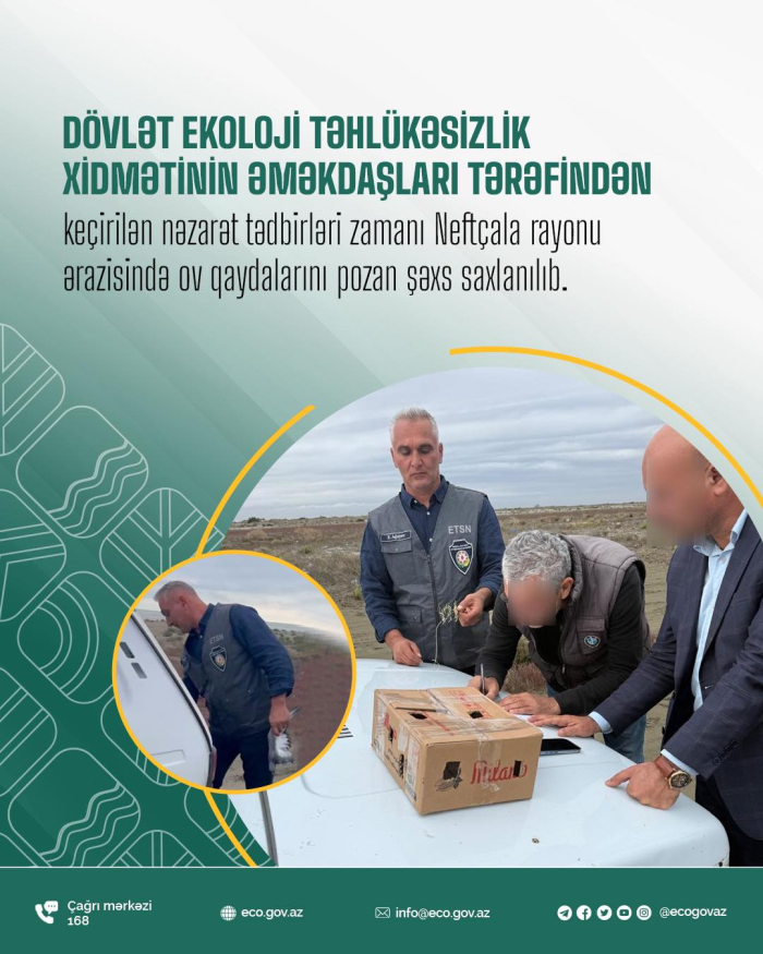 “Ovçuluq haqqında” Azərbaycan Respublikası Qanununun tələblərinə riayət olunması məqsədilə Dövlət Ekoloji Təhlükəsizlik Xidmətinin əməkdaşları tərəfindən keçirilən nəzarət tədbirləri zamanı Neftçala rayonu ərazisində ov qaydalarını pozan şəxs saxlanılıb.