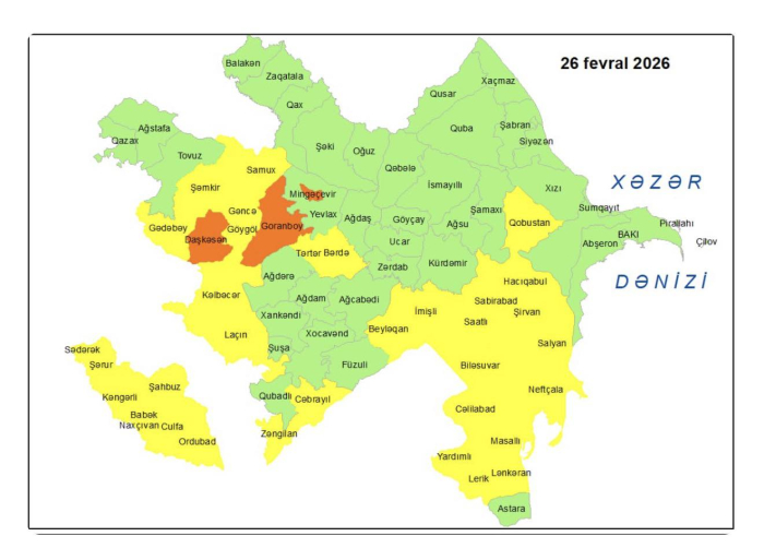 Milli Hidrometeorologiya Xidməti tərəfindən fevralın 26-da bəzi bölgələrdə gözlənilən küləkli hava şəraiti ilə bağlı sarı və narıncı xəbərdarlıq verib.