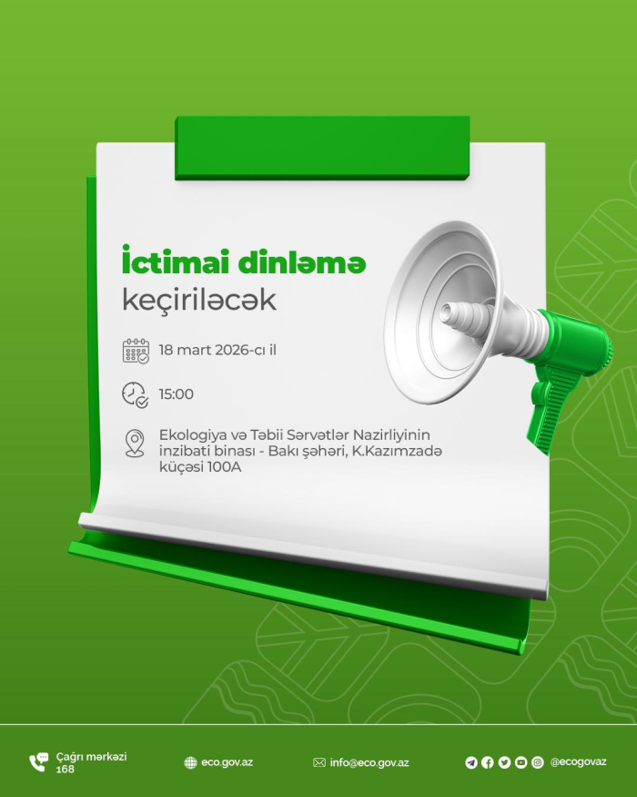 18 mart 2026-cı il tarixində, saat 15:00-da Ekologiya və Təbii Sərvətlər Nazirliyinin inzibati binasında keçiriləcək tədbirdə dövlət qurumları, QHT və KİV nümayəndələri, ekoloqlar və digər maraqlı tərəflər iştirak edəcək.