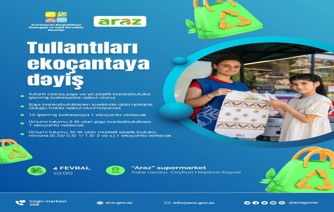 01 Fevral 2025 Quba rayonunun II Nügədi kəndi ərazisində yeni quraşdırılan meteoroloji dopler radara baxış keçirilib. 01 Fevral 2025 Azərbaycanda hava şəraitinin dəyişkənliyi, yüksək temperatur, son günlərdə qeydə alınan duman müxtəlif suallar yaradır. Sualları ekologiya və təbii sərvərlər nazirinin müavini Umayra Tağıyeva cavablandırıb. 31 Yanvar 2025 Ekologiya və Təbii Sərvətlər Nazirliyində 2024-cü ilin yekunlarına və 2025-ci ildə qarşıda duran vəzifələrə həsr olunmuş kollegiya iclası keçirilib. 31 Yanvar 2025 Ekologiya və Təbii Sərvətlər Nazirliyi və “Araz” supermarketlər şəbəkəsinin birgə təşkilatçılığı ilə cari ilin ilk “Tullantıları ekoçantaya dəyiş” aksiyası 4 fevral tarixində Xətai rayonu, Ceyhun Həsənov küçəsində yerləşən “Araz” supermarketin qarşısında keçiriləcək. 31 Yanvar 2025 Milli Hidrometeorologiya Xidmətinin məlumatına əsasən hazırda Yevlax, İmişli, Cəfərxan, Sabirabad, Hacıqabul, Biləsuvar rayonlarında dumanlı hava şəraiti müşahidə olunur və görünüş 200 metrədək məhdudlaşır.