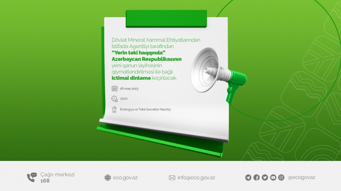Ekologiya və Təbii Sərvətlər Nazirliyi tərəfindən hazırlanmış “Yerin təki haqqında” Azərbaycan Respublikasının Qanun layihəsi ictimai dinləmənin və ictimai müzakirənin təmin edilməsi məqsədilə nazirliyin (eco.gov.az) və Agentliyin (meda.gov.az) saytında yerləşdirilib.