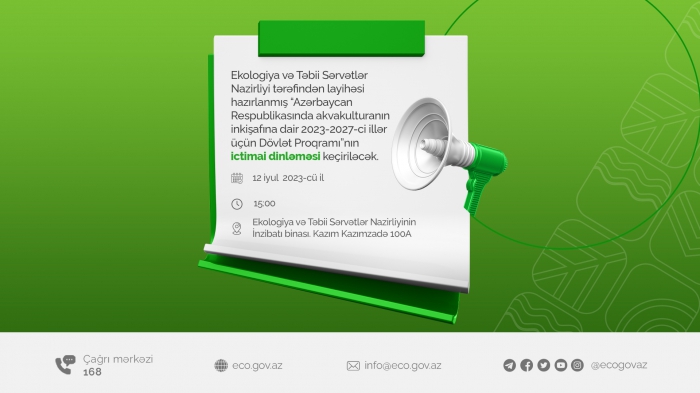 Ekologiya və Təbii Sərvətlər Nazirliyi tərəfindən layihəsi hazırlanmış “Azərbaycan Respublikasında akvakulturanın inkişafına dair 2023-2027-ci illər üçün Dövlət Proqramı”nın ictimai dinləməsi keçiriləcək.