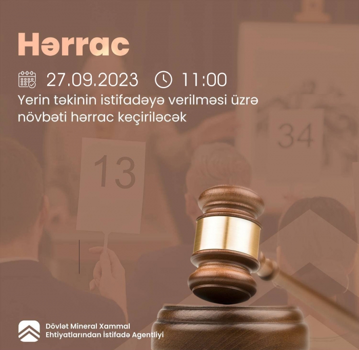 İqtisadiyyat Nazirliyi yanında Əmlak Məsələləri Dövlət Xidmətinin Hərracların Təşkili Mərkəzi və Ekologiya və Təbii Sərvətlər Nazirliyi Dövlət Mineral Xammal Ehtiyatlarından İstifadə Agentliyi tərəfindən sentyabrın 27-də yerin təkinin istifadəyə verilməsi üzrə növbəti hərrac keçiriləcək.