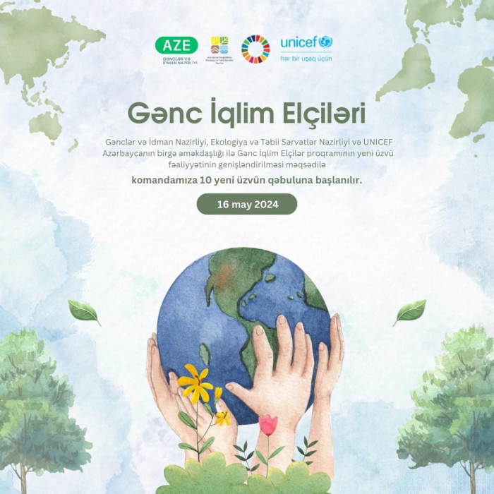 #YaşılüçünGəncİqlimElçiləri həştəqi ilə Ekologiya və Təbii Sərvətlər Nazirliyi, Gənclər və İdman Nazirliyi, UNICEF Azərbaycanın birgə əməkdaşlığı çərçivəsində Gənc İqlim Elçiləri proqramının genişləndirilməsi məqsədilə komandamıza 10 yeni üzvün qəbuluna start verilir. Layihənin əsas məqsədi gənc nəslin bilik və bacarıqlarının artırılması yolu ilə onların ölkənin iqlim dəyişikliyi və ətraf mühitin qorunması sahəsində təşəbbüslərə cəlb edilməsi və eyni zamanda onların iqlim dəyişikliyinə qarşı tədbirlər görməkdə liderlik rolu oynamaq üçün lazım olan bacarıq və biliklərə malik olmasını təmin etməkdir. Seçilmiş Gənc İqlim Elçiləri - gənclərin, eləcə də digər geniş əhali qruplarının iqlim böhranı və ətraf mühitin mühafizəsi barədə maarifləndirilməsində fəal rol oynayacaqlar.