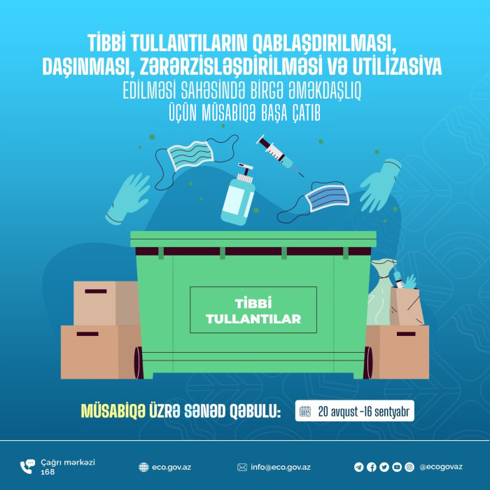 Ekologiya və Təbii Sərvətlər Nazirliyinin “Tullantıları İdarəetmə Mərkəzi” Məhdud Məsuliyyətli Cəmiyyəti ölkə ərazisində yüksək keyfiyyətli ekoloji mühitin yaradılması, tibbi tullantıların idarə edilməsi üsullarının təkmilləşdirilməsində davamlı inkişafa nail olmaq məqsədilə şəffaf, səmərəli və əlverişli əməkdaşlıq edilməsi üçün tibbi tullantıların müvafiq qaydada qablaşdırılması, daşınması, zərərsizləşdirilməsi və utilizasiya edilməsi sahəsində “birgə əməkdaşlıq” üçün elan etdiyi müsabiqə yekunlaşıb.