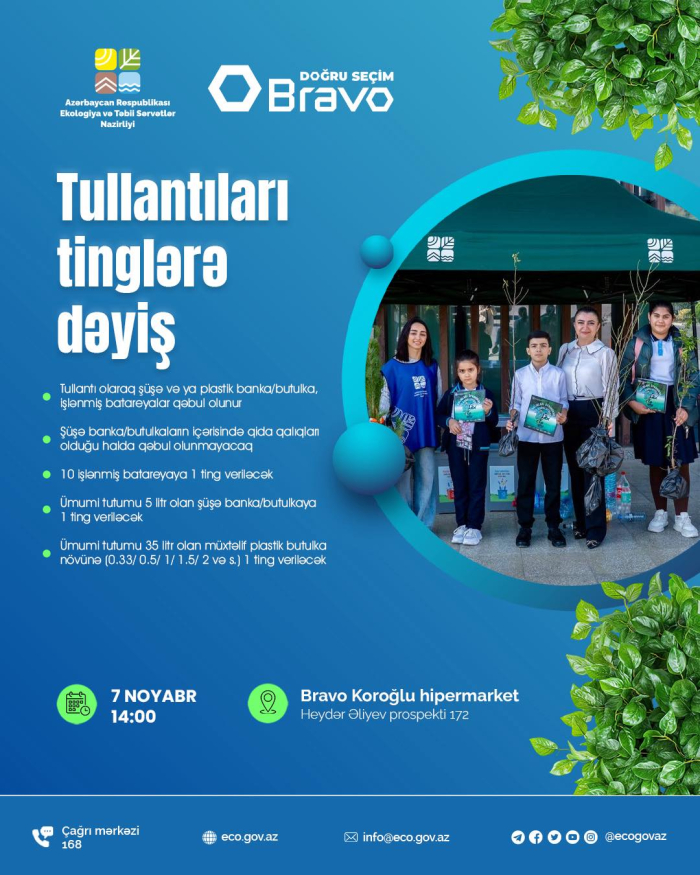 Noyabrın 7-də Ekologiya və Təbii Sərvətlər Nazirliyinin təşkilatçılığı, “Bravo” supermarketlər şəbəkəsinin dəstəyi ilə “Tullantıları tinglərə dəyiş” aksiyası keçiriləcək.