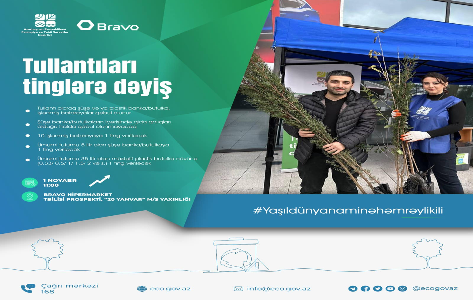 Növbəti “Tullantıları tinglərə dəyiş” aksiyası keçiriləcəkNoyabrın 7-də Ekologiya və Təbii Sərvətlər Nazirliyinin təşkilatçılığı, “Bravo” supermarketlər şəbəkəsinin dəstəyi ilə “Tullantıları tinglərə dəyiş” aksiyası keçiriləcək.
