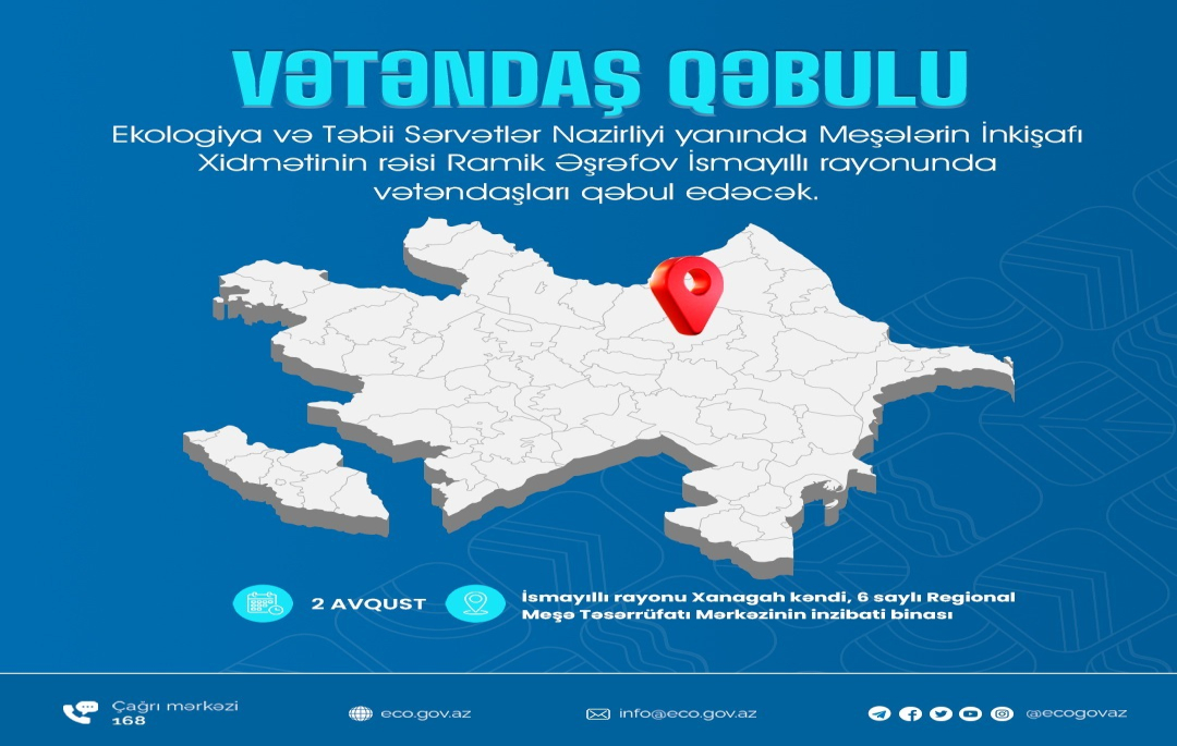 01 Avqust 2024 Hərracın elanı ilə buradan tanış ola bilərsiniz. 30 İyul 2024 Ekologiya və Təbii Sərvətlər Nazirliyi yanında Meşələrin İnkişafı Xidmətinin rəisi Ramik Əşrəfov 02 avqust 2024-cü il tarixində İsmayıllı rayonunda saat 10:00-da İsmayıllı, Qəbələ, Şamaxı və Ağsu rayonlarının sakinlərini qəbul edəcəkdir. 30 İyul 2024 İctimaiyyətin tullantıların düzgün idarə olunması barədə maarifləndirilməsi, çeşidləmə vərdişlərinin stimullaşdırılması məqsədilə 3 avqust tarixində növbəti “Tullantıları hədiyyələrə dəyiş” festivalı Bakı şəhəri “Ağ Şəhər” ərazisində keçiriləcək. 30 İyul 2024 Ekologiya və Təbii Sərvətlər Nazirliyinin təşkilatçılığı, “Araz” supermarketlər şəbəkəsinin dəstəyi ilə “Tullantını dəyərə, ekoçantanı vərdişə çevir” devizi altında növbəti aksiya 2 avqust tarixində Qaradağ rayonu, Sahil qəsəbəsində keçiriləcək. 23 İyul 2024 Tikinti və infrastruktur layihələrinin ekoloji cəhətdən qiymətləndirilməsi, ekoloji rəyin alınması sahəsində şəffaflığın təmin edilməsi və ictimaiyyətin məlumatlandırılması məqsədilə 26 iyul 2024-cü il, saat 15:00-da Dövlət Ekoloji Ekspertiza Agentliyində ictimai dinləmə keçiriləcək.
