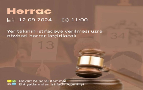 Yer təkindən istifadə ilə bağlı 12 sentyabr 2024-cü il tarixində saat 11:00-da keçiriləcək hərracın elanıHərracın elanı ilə buradan tanış ola bilərsiniz.