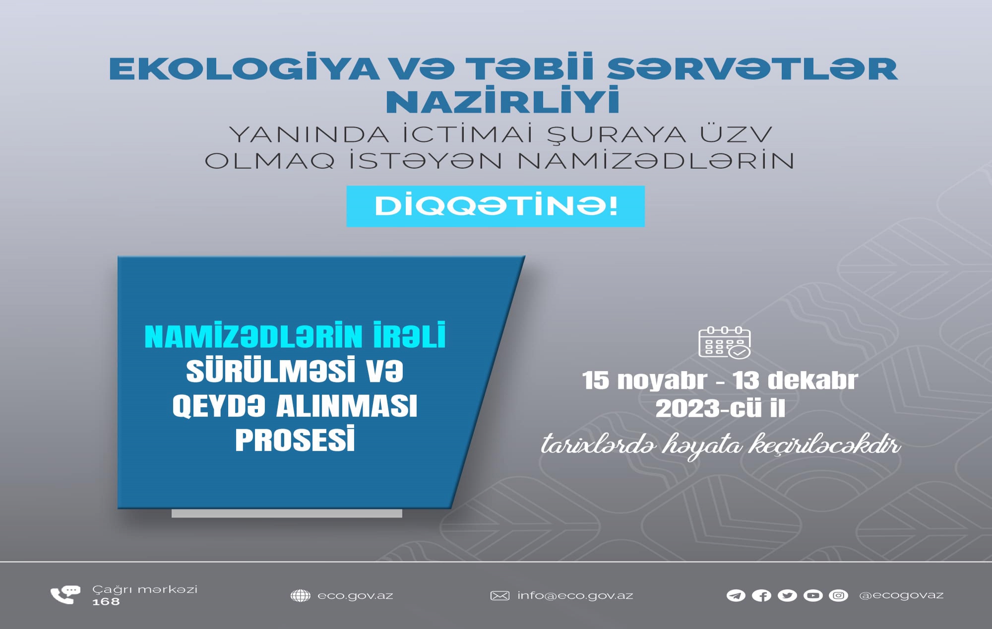 Azərbaycan Respublikası Ekologiya və Təbii Sərvətlər Nazirliyi yanında İctimai Şuranın yeni tərkibinin formalaşdırılması barədə ELANİctimai Şuraya seçkilərin təşkili ilə əlaqədar vətəndaş cəmiyyəti institutları 1 (bir) nəfər şəxsin namizədliyinin irəli sürülməsi məqsədilə ərizəni (namizədin yaşayış ünvanı və elekton poçt ünvanı göstərilməklə) 13.12.2023-cü il tarixinədək