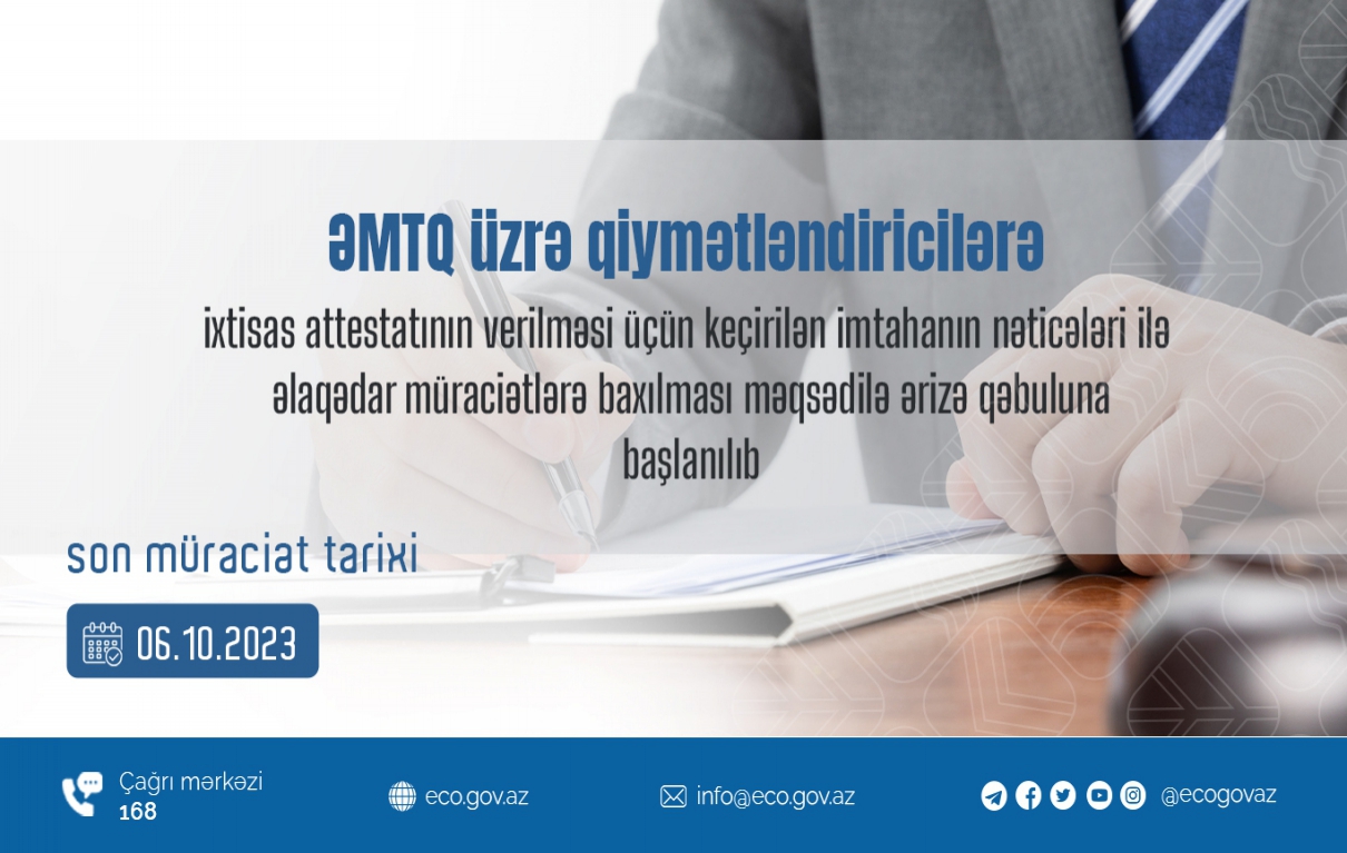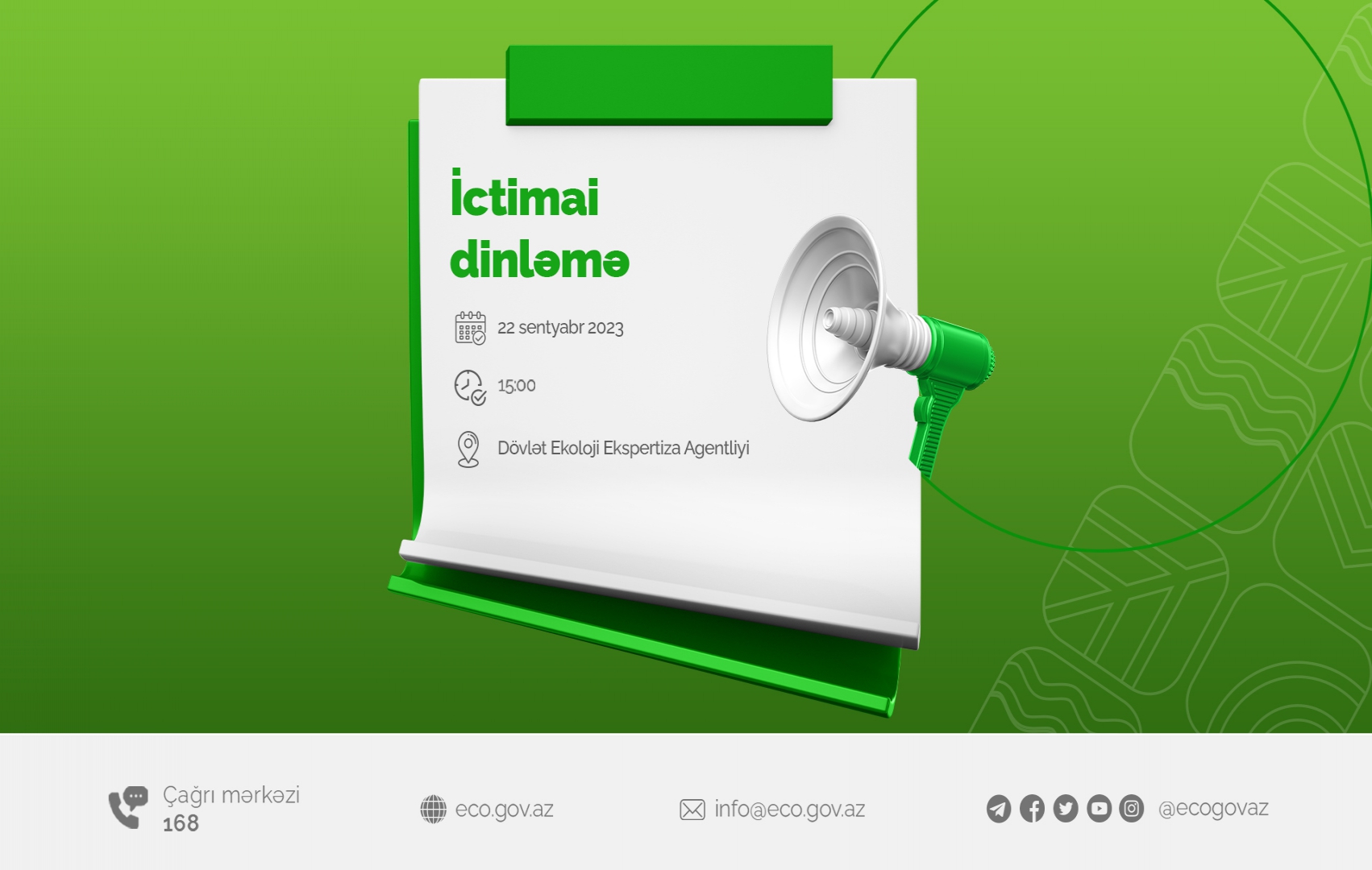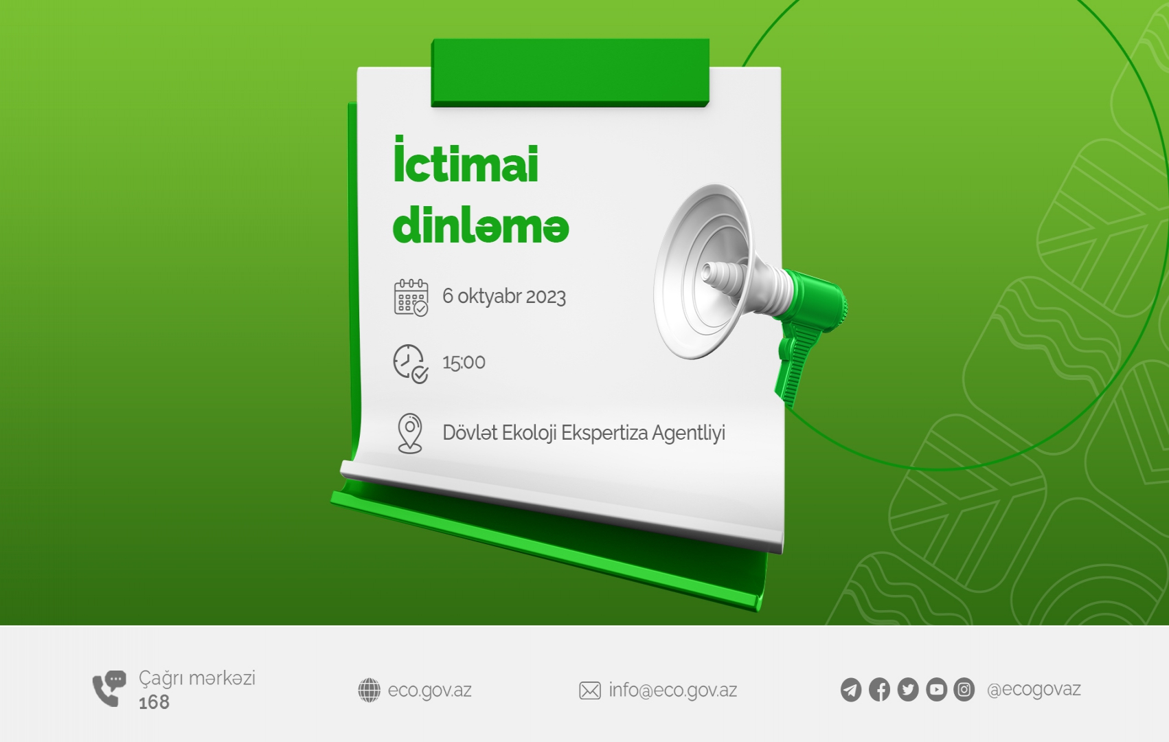 06 Oktyabr 2023 Hərracın elanı, qum-çınqıl yatağının koordinatı və peyk görüntüsü ilə buradan tanış ola bilərsiniz. 03 Oktyabr 2023 Dövlət Ekoloji Ekspertiza Agentliyi tərəfindən Yasamal, Nizami, Nərimanov, Pirallahı və Qaradağ rayonlarının ərazilərindəki müxtəlif ünvanlarda qurumuş və qəzalı ağacların götürülməsi ilə bağlı ictimai dinləmə keçiriləcək. 29 Sentyabr 2023 “Ətraf mühitə təsirin qiymətləndirilməsi üzrə qiymətləndiricilərin ixtisas attestatının forması və attestatın verilməsi, qüvvədəolma müddətinin dayandırılması və ya onun ləğv edilməsi, eləcə də ətraf mühitə təsirin qiymətləndirilməsi üzrə qiymətləndiricilərin və ətraf mühitə təsirin 22 Sentyabr 2023 “Atmosferə atılan istixana qazlarının idarə edilməsi haqqında” Azərbaycan Respublikasının Qanun layihəsinin mətni ictimai müzakirənin təmin edilməsi məqsədilə Nazirliyin (eco.gov.az) rəsmi saytında yerləşdirilib. 21 Sentyabr 2023 Dövlət Ekoloji Ekspertiza Agentliyi tərəfindən Səhiyyə Nazirliyinin inzibati binasının, Saray Modul tipli Vərəm Əleyhinə Xəstəxananın, Mərdəkan Reabilitasiya Pansionatının, Mərdəkan qəsəbəsində yerləşən “Sahil” düşərgəsinin və “Xətai Park” MMC tikinti şirkətinin inşa etdiyi yaşıyış kompleksinin ərazisində olan qurumuş və qəzalı ağacların götürülməsi ilə bağlı ictimai dinləmə keçiriləcək.