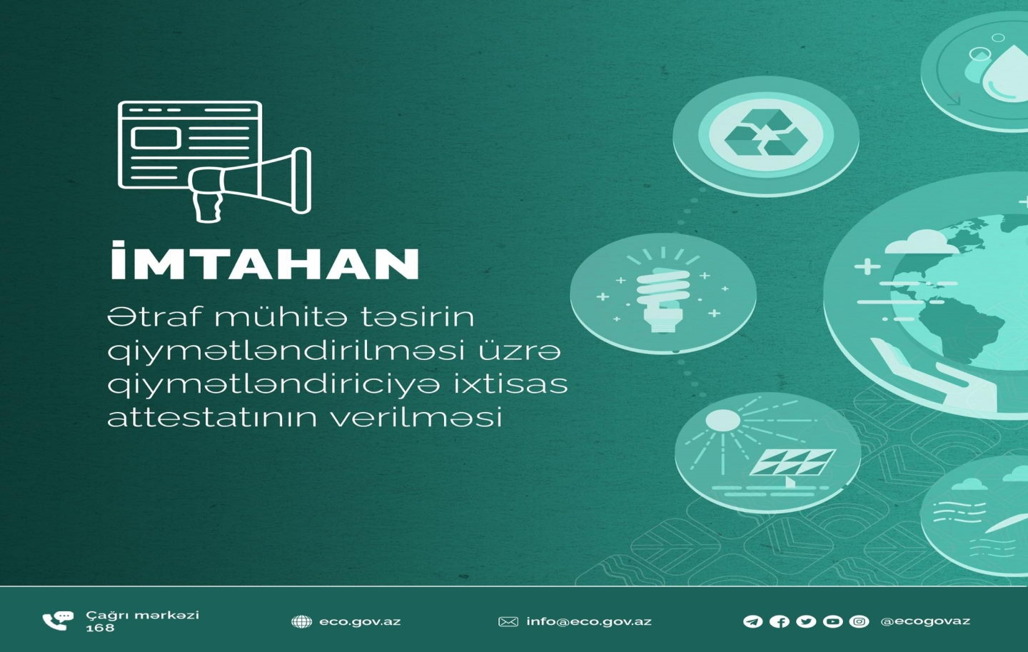 Ətraf mühitə təsirin qiymətləndirilməsi üzrə qiymətləndiriciyə ixtisas attestatının verilməsi məqsədilə imtahan keçiriləcək29 sentyabr 2023-cü il, saat 10:00 tarixində Azərbaycan Respublikası Nazirlər Kabinetinin 2019-cu il 27 noyabr tarixli 457 nömrəli Qərarı ilə təsdiq edilmiş “Ətraf mühitə təsirin qiymətləndirilməsi üzrə qiymətləndiricilərin ixtisas attestatının forması və attestatın verilməsi, qüvvədəolma müddətinin dayandırılması və ya onun ləğv edilməsi, eləcə də ətraf mühitə təsirin qiymətləndirilməsi üzrə qiymətləndiricilərin və ətraf mühitə təsirin qiymətləndirilməsi üzrə təşkilatların reyestrinin aparılması və onların fəaliyyətinə nəzarətin həyata keçirilməsi” Qaydasının tələblərinə uyğun olaraq ixtisas attestatının verilməsi məqsədilə Azərbaycan Dövlət İqtisad Universitetində imtahan keçiriləcək.