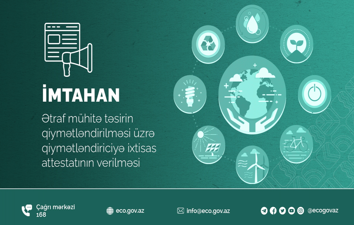 İmtahan - Ətraf mühitə təsirin qiymətləndirilməsi üzrə qiymətləndiriciyə ixtisas attestatının verilməsiAzərbaycan Respublikası Nazirlər Kabinetinin 2019-cu il 27 noyabr tarixli 457 nömrəli Qərarı ilə təsdiq edilmiş “Ətraf mühitə təsirin qiymətləndirilməsi üzrə qiymətləndiricilərin ixtisas attestatının forması və attestatın verilməsi, qüvvədəolma müddətinin dayandırılması və ya onun ləğv edilməsi,