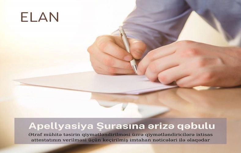 06 Avqust 2022 İqtisadiyyat Nazirliyi yanında Əmlak Məsələləri Dövlət Xidmətinin Hərracların Təşkili üzrə Auksion Mərkəzi və Ekologiya və Təbii Sərvətlər Nazirliyi yanında Meşələrin İnkişafı Xidməti 19 İyul 2022 Ətraf mühitə təsirin qiymətləndirilməsi üzrə qiymətləndiricilərə ixtisas attestatının verilməsi üçün 2022-ci il 18 iyul tarixində keçirilən imtahanın nəticələri ilə əlaqədar müraciətlərə baxılması üçün Apellyasiya Şurasına ərizə qəbuluna başlanılıb.