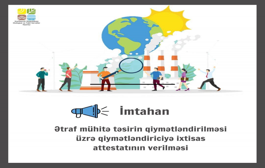 Ətraf mühitə təsirin qiymətləndirilməsi üzrə qiymətləndiriciyə ixtisas attestatının verilməsiAzərbaycan Respublikası Nazirlər Kabinetinin 2019-cu il 27 noyabr tarixli 457 nömrəli Qərarı ilə təsdiq edilmiş “Ətraf mühitə təsirin qiymətləndirilməsi üzrə qiymətləndiricilərin ixtisas attestatının forması və attestatın verilməsi, qüvvədəolma müddətinin dayandırılması və ya onun ləğv edilməsi, eləcə də ətraf mühitə təsirin qiymətləndirilməsi üzrə qiymətləndiricilərin və ətraf mühitə təsirin qiymətləndirilməsi üzrə təşkilatların reyestrinin aparılması və onların fəaliyyətinə nəzarətin həyata keçirilməsi” Qaydasının təşkili ilə bağlı olaraq ixtisas attestatının verilməsi üçün keçiriləcək imtahanda iştirakla bağlı 10 aprel tarixinədək aşağıda göstərilən sənədlərin təqdim olunması xahiş olunur.