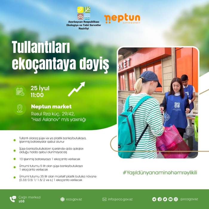 Ekologiya və Təbii Sərvətlər Nazirliyinin təşkilatçılığı, “Neptun” supermarketlər şəbəkəsinin dəstəyi ilə növbəti “Tullantıları ekoçantaya dəyiş” aksiyası 26 iyul tarixində “Neptun” supermarketlər şəbəkəsinin “Həzi Aslanov” m/s yaxınlığı, Rəsul Rza küç., 29/42 ünvanında yerləşən filialında təşkil olunacaq.
