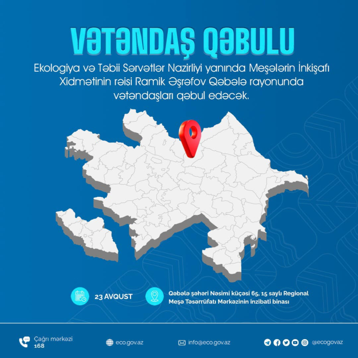 Ekologiya və Təbii Sərvətlər Nazirliyi yanında Meşələrin İnkişafı Xidmətinin rəisi Ramik Əşrəfov 23 avqust 2024-cü il tarixində Qəbələ şəhərində saat 11:00-da Qəbələ, İsmayıllı, Oğuz, Göyçay və Ağdaş rayonlarının sakinlərini qəbul edəcəkdir.