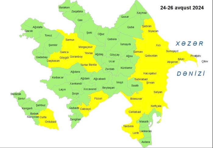 Avqustun 24-26-da Bakıda və Abşeron yarımadasında, eyni zamanda bölgələrdə gözlənilən küləkli hava şəraiti ilə bağlı Milli Hidrometeorologiya Xidməti tərəfindən sarı xəbərdarlıq verilib.