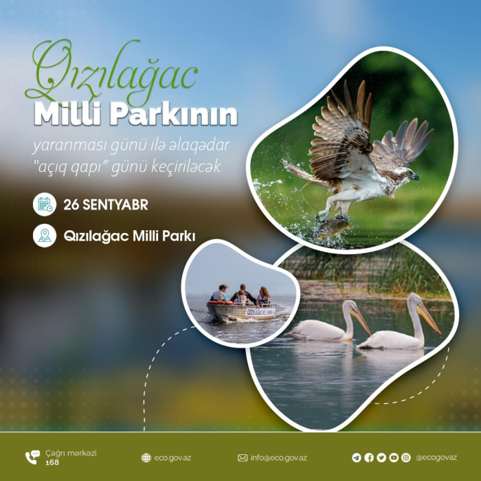 Xəzər dənizinin cənub-qərbində yerləşən, unikal ekosistemi ilə fərqlənən Qızılağac Milli Parkının yaranması günü ilə əlaqədar sentyabrın 26-da milli parkda “açıq qapı” günü keçiriləcək və ziyarətçilər giriş haqqından azad olunacaq.