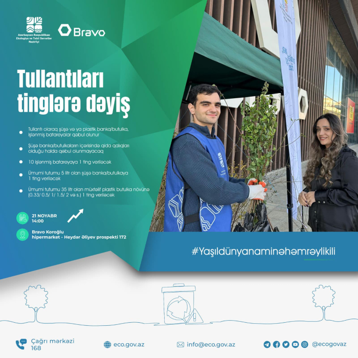 Noyabrın 21-də Ekologiya və Təbii Sərvətlər Nazirliyinin təşkilatçılığı, “Bravo” supermarketlər şəbəkəsinin dəstəyi ilə “Tullantıları tinglərə dəyiş” aksiyası keçiriləcək.