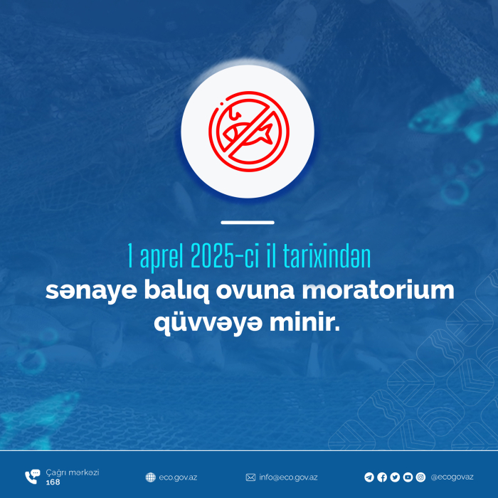 Balıq və digər su bioresurslarının kürüləmə dövrü ilə əlaqədar Kür çayında, Sarısu gölündə, Mingəçevir, Şəmkir, Araz, Yenikənd su anbarlarında 1 aprel 2025-ci il tarixindən sənaye balıq ovuna moratorium qüvvəyə minir.
