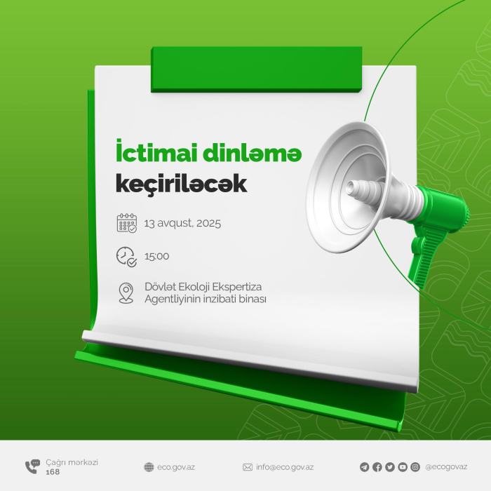 13 avqust 2025-ci il tarixində, saat 15:00-da Dövlət Ekoloji Ekspertiza Agentliyində keçiriləcək tədbirdə dövlət qurumları, QHT və KİV nümayəndələri, ekoloqlar iştirak edəcək.