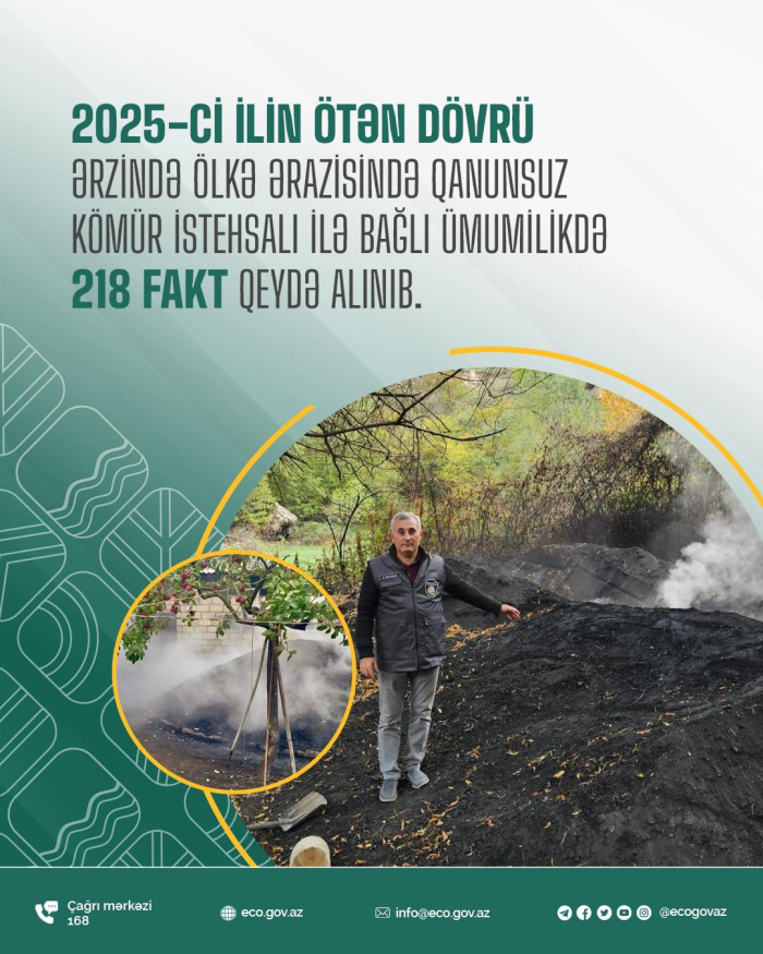 Dövlət Ekoloji Təhlükəsizlik Xidmətinin əməkdaşları tərəfindən keçirilən nəzarət tədbirləri zamanı 2025-ci ilin ötən dövrü ərzində ölkə ərazisində qanunsuz kömür istehsalı ilə bağlı ümumilikdə 218 fakt qeydə alınıb.