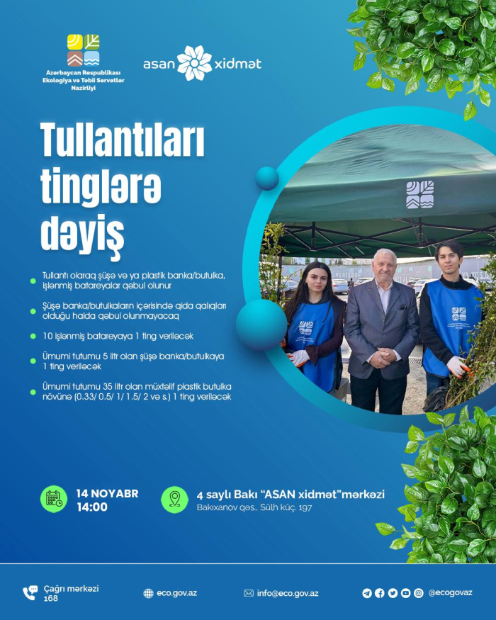 Noyabrın 14-də Ekologiya və Təbii Sərvətlər Nazirliyinin təşkilatçılığı, “ASAN xidmət” mərkəzinin dəstəyi ilə “Tullantıları tinglərə dəyiş” aksiyası keçiriləcək.