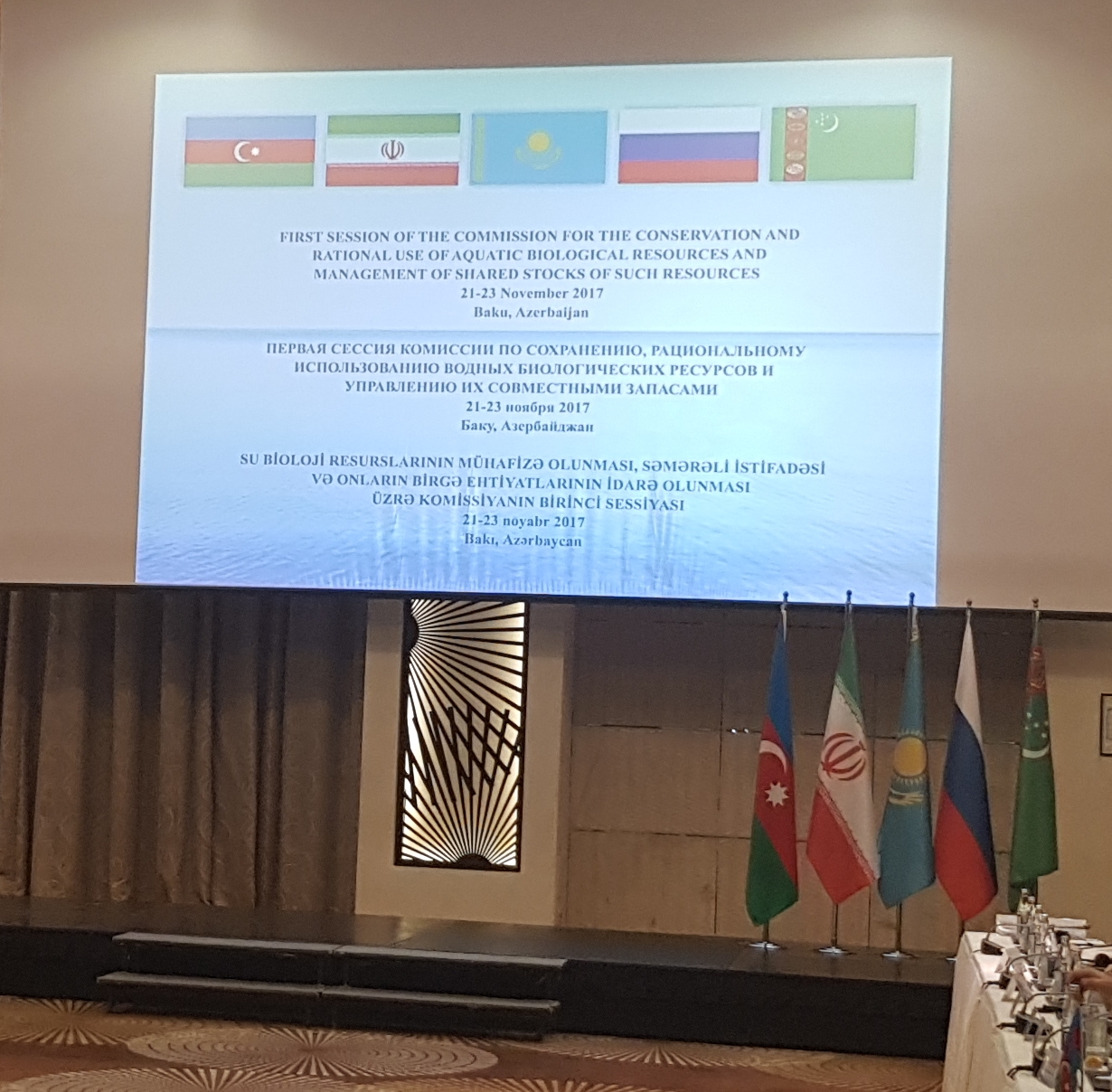 21 noyabr 2017-ci il tarixində Bakı şəhərində Xəzər dənizinin Su bioloji resurslarının mühafizə olunması, səmərəli istifadəsi və onların birgə ehtiyatlarının idarə olunması üzrə Komissiyanın 1-ci Təsisedici Hökumətlərarası Sessiyası öz işinə başlayıb.
