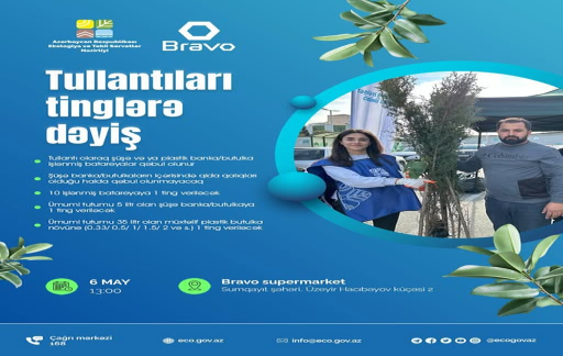 Sumqayıtda “Tullantıları tinglərə dəyiş” aksiyası keçiriləcəkMayın 6-da Ekologiya və Təbii Sərvətlər Nazirliyinin təşkilatçılığı, “Bravo” supermarketlər şəbəkəsinin dəstəyi ilə növbəti “Tullantıları tinglərə dəyiş” aksiyası keçiriləcək.
