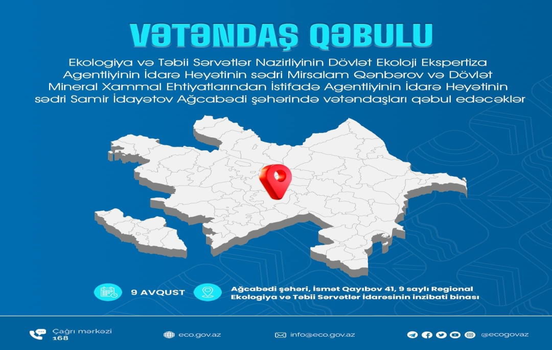 Səyyar vətəndaş qəbulu barədəEkologiya və Təbii Sərvətlər Nazirliyinin Dövlət Ekoloji Ekspertiza Agentliyinin İdarə Heyətinin sədri Mirsalam Qənbərov və Dövlət Mineral Xammal Ehtiyatlarından İstifadə Agentliyinin İdarə Heyətinin sədri Samir İdayətov 09 avqust 2024-cü il tarixində Ağcabədi şəhərində saat 11:00-da Ağcabədi, Beyləqan, Bərdə, Tərtər, Füzuli, İmişli və Zərdab rayonlarının sakinlərini qəbul edəcəkdir.