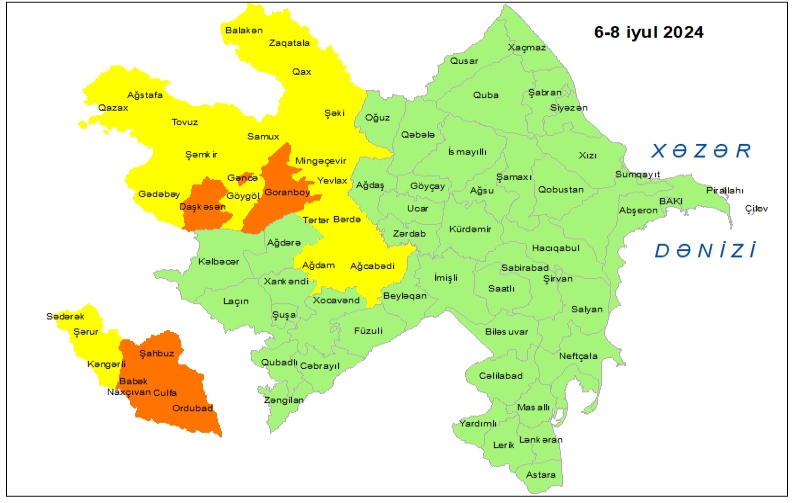 İyulun 6-sı axşamdan 8-i gündüzədək bölgələrdə gözlənilən küləkli hava şəraiti ilə bağlı Milli Hidrometeorologiya Xidməti tərəfindən sarı və narıncı xəbərdarlıq verilib.