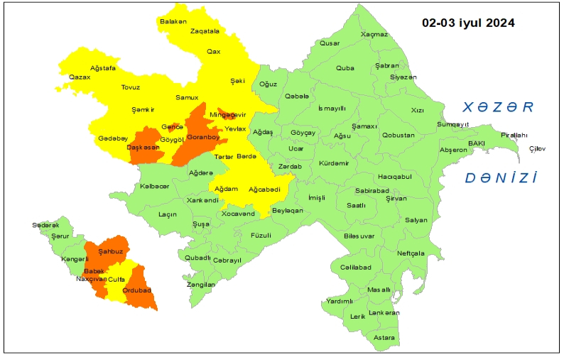 Güclü küləklə bağlı sarı və narıncı xəbərdarlıqİyulun 2-3-də bölgələrdə gözlənilən güclü küləkli hava şəraiti ilə bağlı Milli Hidrometeorologiya Xidməti tərəfindən sarı və narıncı xəbərdarlıq verilib.
