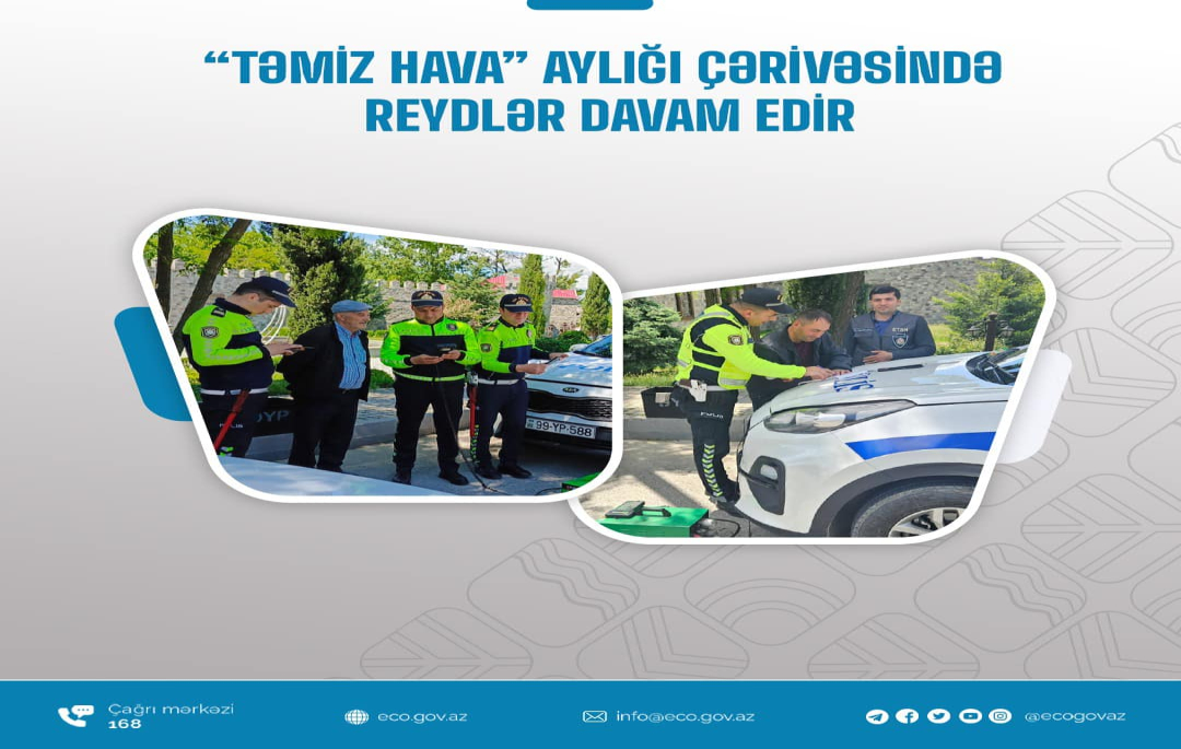 “Təmiz hava” aylığı çərçivəsində reydlər davam edirEkologiya və Təbii Sərvətlər Nazirliyinin Dövlət Ekoloji Təhlükəsizlik Xidmətinin və Daxili İşlər Nazirliyinin Baş Dövlət Yol Polisi İdarəsinin əməkdaşları tərəfindən “Təmiz hava” aylığı çərçivəsində birgə reydlər davam etdirlir.