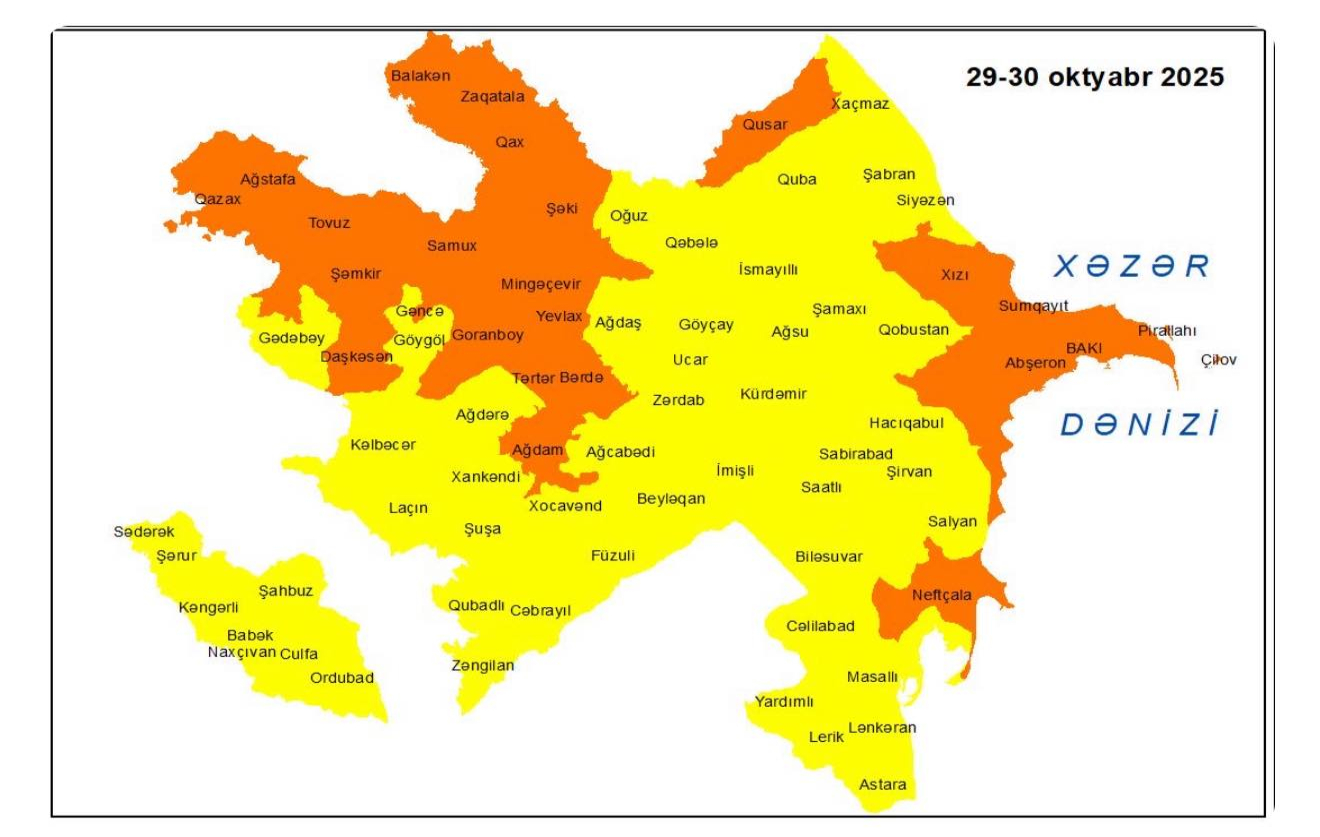 Küləkli hava şəraiti ilə bağlı sarı və narıncı xəbərdarlıq verilibMilli Hidrometeorologiya Xidməti oktyabrın 29-u gündüzdən 30-u gündüzədək Bakıda və Abşeron yarımadasında, eyni zamanda əksər bölgələrdə gözlənilən küləkli hava şəraiti ilə bağlı sarı və narıncı xəbərdarlıq verib.